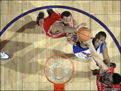 در ادامه مسابقات بسکتبال حرفه ای آمریکا (NBA)، در دیدار فينیکس سانز و هیوستون راکتز، بازیکنان دو تیم برای تصاحب توپ تلاش می کنند. این مسابقه در آریزونا برگزار شد و با نتیجه 103 بر 82 به سود فينیکس به پایان رسید.