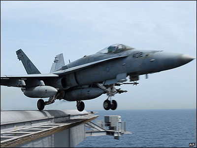جنگنده اف ای 18 آمريکايی از روی ناو جان سی استنيس در جريان مانور نظامی آمريکا در خليج فارس به پرواز در می آيد. |