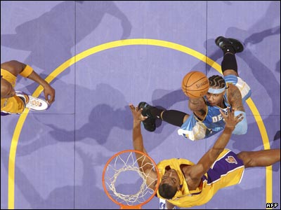 در ادامه مسابقات بسکتبال حرفه ای آمریکا (NBA)، دنور ناگتز و لس آنجلس لیکرز، بازیکنان دو تیم به سمت سبد حمله می کنند. این بازی در سالن استیپل کالیفرنیا برگزار شد.