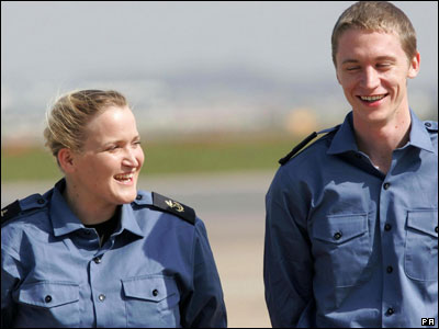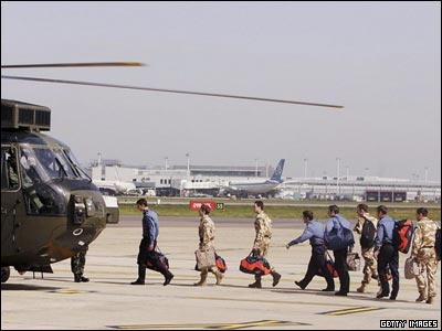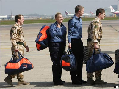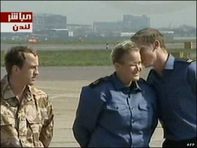 روز پنجشنبه، 5 آوریل، هواپیمای حامل پانزده عضو نیروی دریایی و واحد تفنگداران دریایی بریتانیا حدود 11 صبح به وقت گرینویچ در فرودگاه هیثرو لندن به زمین نشست و این افراد بلافاصله با هلی کوپترهای نیروی هوایی به یک پایگاه نظامی واقع در جنوب غرب این کشور انتقال یافتند و انتظار می رود در این محل به خانواده های خود ملحق شوند.