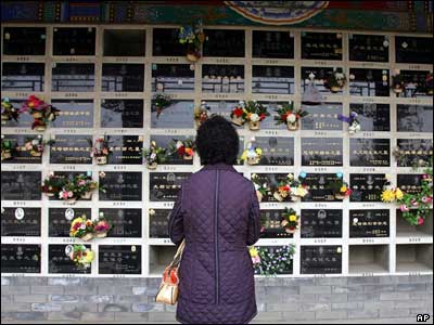 یک زن چینی در قبرستانی در پکن به دیواری که در آن خاکستر مردگان نگهداری می شود، چشم دوخته است.