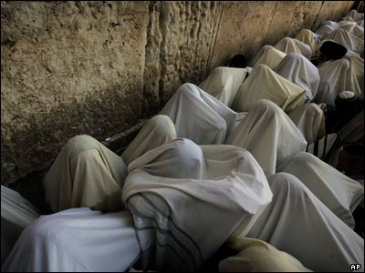 مردان یهودی در کنار دیوار غربی، مقدس ترین بخش بیت المقدس، مشغول برگزاری مراسم دعا و نیایش اند.