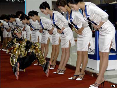 در نمایشگاه اتومبیل سئول، مانکن های کره جنوبی از یک اسکیت باز فرانسوی استقبال می کنند.