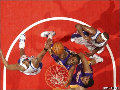 در ادامه مسابقات بسکتبال حرفه ای آمریکا (NBA)، بازیکنان دو تیم لس آنجلس کلیپرز و لس آنجلس لیکرز، به سمت سبد حمله می کنند. این بازی در سالن استیپل کالیفرنیا برگزار شد.