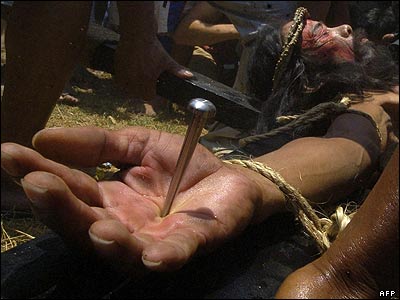 یک مسیحی به رغم مخالفت کلیسای کاتولیک، در غالب مراسم مذهبی ایام عید پاک به صلیب کشیده شده است.