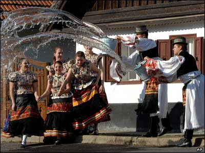 در شرق بوداپست در مجارستان، پسران جوان با لباس سنتی روی چند دختر آب می ریزند. این کار بخشی از مراسم منحصر به فرد این منطقه در ایام عید پاک است.