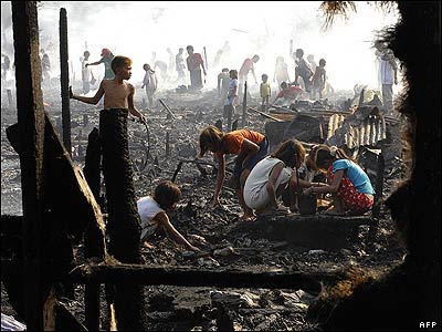 در پی آتش سوزی در یک منطقه فقیر نشین مانیل، ساکنین محل در بین ویرانه ها سرگرم جستجو برای یافتن اشیایی هستند که در آتش سوزی سالم مانده اند |