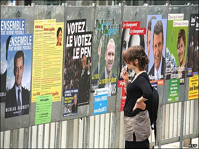 یک زن در حال نگاه کردن به پوسترهای تبلیغاتی کاندیداهای ریاست جمهوری فرانسه، در شهر مونپلیه در جنوب فرانسه