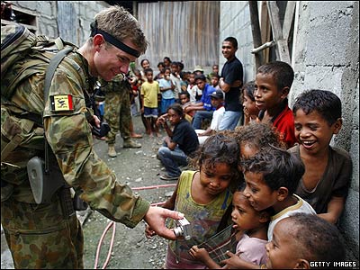 یک عضو نیروهای حافظ صلح استرالیایی عکس دیجیتالی را که درحین ماموریت، از کودکان در دیلی، مرکز تیمور شرقی برداشته به آنان نشان می دهد