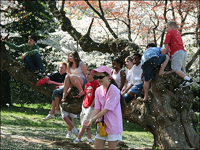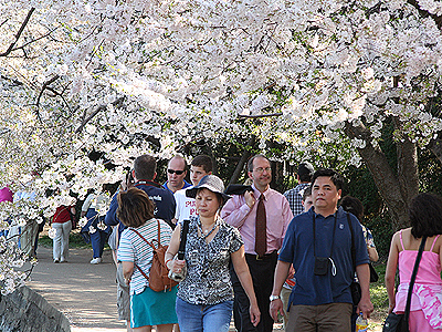 اين جهانگردان از شهرهای مختلف آمريکا و کشورهای گوناگون جهان برای ديدن شکوفه چهار هزار درخت گيلاس در تايدال بيسن کنار رودخانه پوتوماک واشنگتن و جشن و شادمانی که به اين مناسبت برپا می شود به اين شهر می آيند.