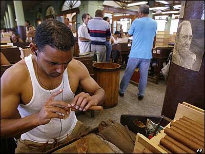 یک کارگر کارخانه دخانیات در هاوانا. در سمت راست ، پوستر فیدل کاسترو رهبر کوبا دیده می شود
