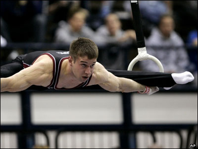 آلکس اسکورچ، ژیمناست اهل استنفورد، در حال اجرای حلقه در مسابقات ملی ژیمناستیک دانشگاه های آمریکا