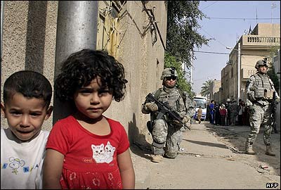 یک سرباز آمریکایی در حال گشت در شهرک فقیرنشین صدر، در بغداد. ساکنین این شهرک عمدتا شیعه اند