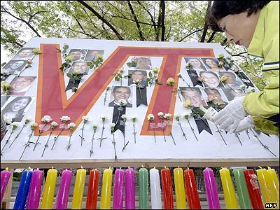 یک شهروند کره جنوبی در حال روشن کردن شمع در مراسم یادبود قربانیان کشتار در دانشگاه ویرجینیا، در برابر سفارت آمریکا در سئول. عامل کشتار یک کره جنوبی تبار بود