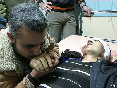 یک مرد فلسطینی در حال بوسیدن دست محمد عابد، یک مامور پلیس 23 ساله است که در جریان عملیات در روستای کفر دان، در نزدیکی شهر جنین در ساحل غربی، توسط سربازان اسرائیلی کشته شد.