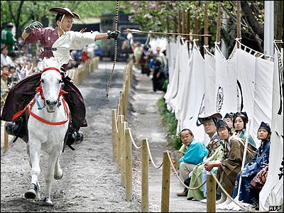 یک تیرانداز سوارکار که لباس شکار جنگجویان سامورایی را پوشیده درحال پرتاب نیزه درجریان مراسم تیراندازی سوارکاران در توکیو.