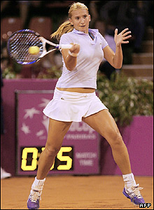 در سومین بازی انفرادی بین تیم های فرانسه - ژاپن، در اولین دوره مسابقات جام فدراسیون تنیس ، تاتینا گولووین فرانسوی ضربه توپ الی سوگی یاما از ژاپن را برمی گرداند