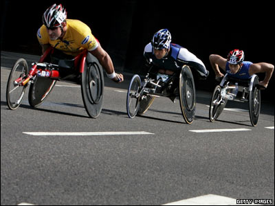 سه شرکت کننده اول بخش با ویلچر ماراتون لندن بعد از خروج از تونل آخرین سه مایل این مسابقه را شروع می کنند