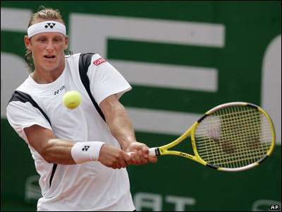 دیوید نعلبندیان آرژانتینی توپ کارلوس مویا از اسپانیا را پاسخ می دهد. این دیدار که در چارچوب مسابقات تنیس آزاد بارسلونا برگزار شد، با نتیجه دو بر صفر به سود نعلبندیان به پایان رسید.