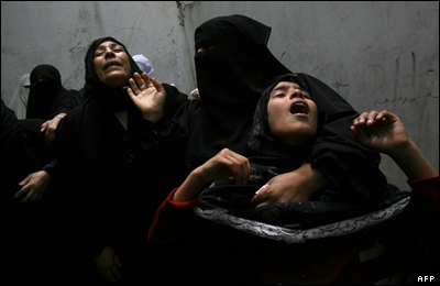 خویشاوندان عبدالحلیم الفیومی، از اعضای حماس که به اتفاق سه فلسطینی دیگر هدف گلوله سربازان اسرائیلی قرار گرفت، در حال سوگواری در مراسم به خاک سپاری او هستند