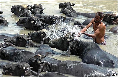 باگات سینگ، یک گله دار هندی در داخل یک کانال آب، در حال آب پاشی به روی گاو میش هایش است. موج گرما در شمال هند موجب بسته شدن برخی از مدارس شد و گرمای هوای دهلی به بالاتر از چهل درجه سانتیگراد رسید |
