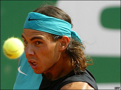 رافائل نادال، تنیس باز اسپانیایی و نفر دوم جهان، در صحنه ای از دیدار یک چهارم نهایی تنیس آزاد بارسلونا مقابل پوتیتو استراچه از ایتالیا. نادال این مسابقه را در دو ست پیاپی برد.