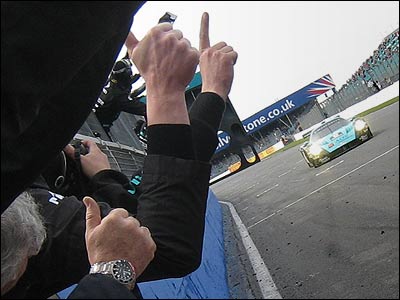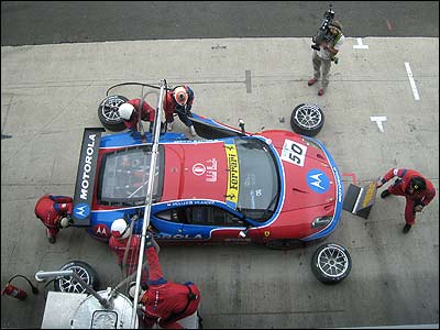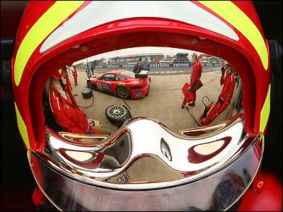مسابقات GT3، جديدترين مسابقه اتومبيلرانی از سوی فدراسيون جهانی اتومبيلرانی بود که سال گذشته برای اولين بار در همین پيست برگزار شد. ( انعکاس اتومبیل تیم فراری 550 در عینک یکی از اعضای تیم)