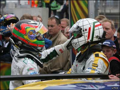تارکوئینی(چپ) اولین پیروزی سیئات را در مسابقات فصل جدید برای تیمش کسب کرد و آگوستو فارفوس راننده برزیلی تیم بی.ام.و که توانست در مقام دوم از خط پایان بگذرد با 28 امتیاز صدرنشینی خود در فصل جدید را حفظ کرد. |