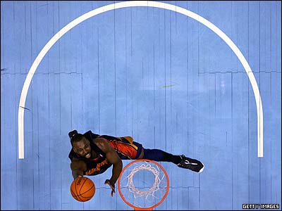 بارون دیویس بازیکن تیم گلدن استیت واریورز، به سمت سبد یوتا جز حمله می کند. بازی بین دو تیم در سالت لیک سیتی در یوتا برگزار شد.