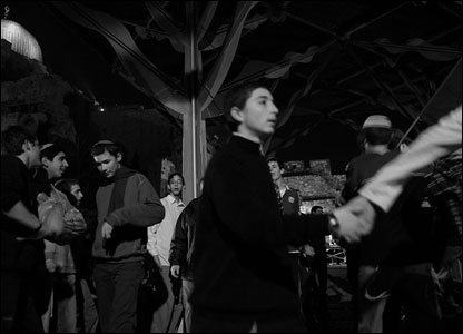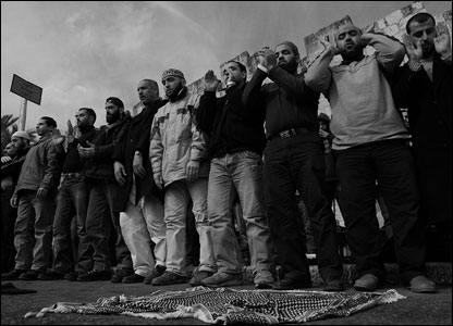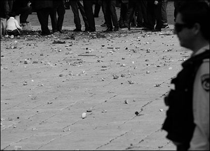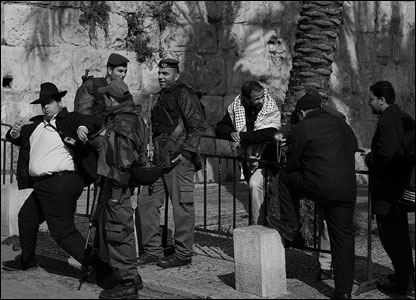 6 فوریه 2007 مسلمانان به تجمعی صلح آمیز نزدیک باب المغاربه دست زدند. پلیس های اسرائیلی و تظاهرکنندگان فلسطینی به رقص شکم یک یهودی اورتدوکس می خندند.