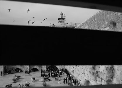این عکس از داخل مسیر رفت آمدی که مقامات اسرائیلی می خواهند آن را جایگزین کنند گرفته شده است. پائین تصویر یهودیان در مقابل دیوار ندبه نیایش می کنند.