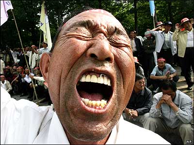 کشاورزی از کره جنوبی در اعتراض به پیمان تجارت آزاد که بين آمريکا و کره جنوبی امضاء شده است، در جريان تظاهراتی که در سئول شعار می دهد.