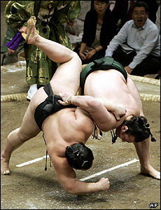 آساهوريو از مغولستان (چپ) قهرمان کشتی سومو، در تورنمنت بزرگ تابستانی سومو در توکیو از از کوتوشو از بلغارستان شکست خورد.