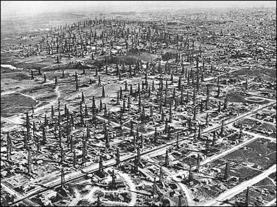 با این همه یکی از مسائلی که در بسیاری عکس های هاپ قابل مشاهده است، دغدغه تغییر سریع چهره زمین و بهره برداری تجاری از آن بود. میدان نفتی سیگنال هیل در لس آنجلس (1926) |