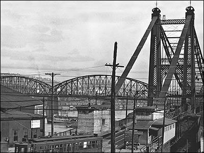 هاپ برای تهیه عکس هایش با قطار و اتومبیل سراسر آمریکا را سفر می کرد و در شکل تیرآهن ها و سنگ ها به دنبال زیبایی و معنا می گشت. پلی در بارانداز و تراموای در حال عبور در پیستبرگ (1926)