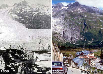 گری براش (Gary Braasch)، عکاس آمریکایی، از سال 1999 تاکنون سرگرم عکسبرداری از تاثیرات تغییرات جوی بر محیط زیست بوده است. تصویر چپ توسط یک هنرمند در سال 1859 خلق شده و یخچال رون در سوئیس را نشان می دهد که چگونه روستای "ولی" را پوشانده است. عکس سمت راست: همین یخچال را در سال 2001 نشان می دهد که به اندازه دو کیلومتر و نیم کوچکتر شده است.