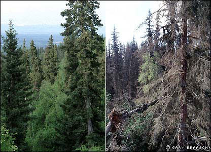 گرمایش زمین احتمالا برای سوسک های درخت خوار مفید خواهد بود چون می توانند به میزان بالایی تولید مثل کنند. این تصاویر آسیب ناشی از آفات به درختان آلاسکا را نشان می دهد. |