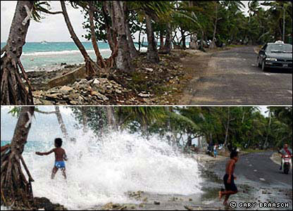 نقاط دیگر جهان نیز احتمالا با تغییرات شدید محیط زیستی مواجه خواهند شد. ای پی سی سی (IPCC)، که کنسرسیومی از چندین هزار دانشمند مستقل است پیش بینی کرده که سطح آب دریاها در قرن بعدی احتمالا بین 9 تا 88 سانتیمتر افزایش خواهد داشت. چنین وضعیتی برای جزایری که در سطوح پایین تر قرار دارند، خطرآفرین است. این تصاویر هم تاثیرات امواج بزرگ را نشان می دهد.