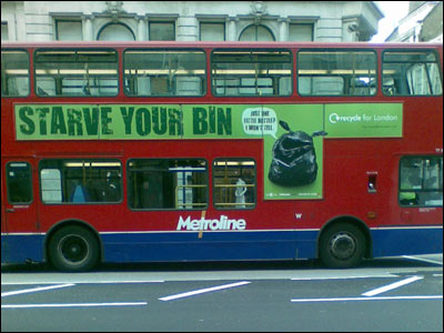 مشکل تغییر آب و هوا به موضوعی اجتماعی در بریتانیا و بسیاری از کشورهای جهان تبدیل شده است. یکی از اصلی ترین راه های مبارزه با این وضعیت صرفه جویی در سوخت های فسیلی است. | | از جمله حوزه هایی که این نوع انرژی مصرف بالایی دارد حوزه تولید انواع کالاها و مواد غذایی است. کاهش زباله باقی مانده از مصرف این کالاها و همچنین بازیافت آنها می تواند به میزان زیادی به صرفه جویی در انرژی و نهایتا مقابله با گرمایش زمین کمک کند. اخیرا شهرداری لندن و گروه های محیط زیست دست به انتشار آگهی های تلویزیونی، رادیویی و پوسترهای خیابانی زده اند تا مردم را نسبت به بازیافت زباله آشنا کنند. این پوستر هم یکی از این تبلیغات است که روی بدنه اتوبوس ها قرمز لندن مشاهده می شود |