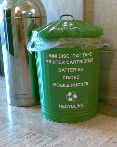 | | در ساختمان های اداری نیز سطل های متعددی به زباله های قابل بازیافت اختصاص داده شده است. این سطل هم سبز است (نشانه ای از حفظ محیط زیست) و هم آرم سه گوش معروف بازیافت را بر خود دارد و برای زباله دی وی دی، سی دی، ... استفاده می شود |