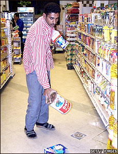 برخی شرکت های دانمارکی بيشتر تحت تاثير خشم مسلمانان قرار گرفته اند. يکی از کارکنان يک فروشگاه در مصر محصولات دانمارکی را از قفسه فروشگاه بيرون می کشد.