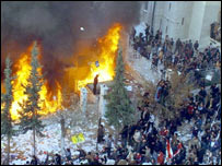 مسلمانان خشمگين به سفارت دانمارک در شهر بيروت، پايتخت لبنان حمله کرده و آن را به آتش کشيده اند. بنابر گزارش ها، از پنجره های ساختمان دود و شعله آتش به بيرون زبانه می کشيد. گفته می شود هيچيک از اعضای سفارتخانه در آن زمان در داخل ساختمان نبوده اند اما چندين نفر از معترضين و نيروهای پليس مجروح شده اند. دولت دانمارک از اتباع خود خواسته است هر چه زودتر خاک لبنان را ترک کنند. پيشتر، نيروهای امنيتی لبنان به سوی تظاهرکنندگان گاز اشک آور شليک کرده بودند اما يکی از خبرنگاران بی بی سی در بيروت می گويد زمانی که افراد تندرو از ميان جمعيت به جلو آمدند، پليس عقب نشينی کرد. حمله مسلمانان خشمگين به سفارت دانمارک در بيروت، تازه ترين مورد از رشته اعتراض های مردم کشورهای اسلامی به کاريکاتورهايی درباره حضرت محمد است که ابتدا در يک روزنامه دانمارکی به چاپ رسيده بود. در افغانستان هم چندين هزار نفر در اعتراض به اين کاريکاتورها دست به تظاهرات زدند و پليس برای متفرق کردن معترضين در شهر مهترلام واقع در ولايت لغمان دست به تيراندازی هوايی زد. روز شنبه نيز افراد معترض به انتشار کاريکاتورهای پيامبر اسلام در روزنامه های غربی، به سفارت های دانمارک و نروژ در دمشق، پايتخت سوريه، يورش برده و آنها را به آتش کشيدند. دانمارک و نروژ، دولت سوريه را محکوم کرده اند که نتوانسته از حمله شهروندان خشمگين سوری به سفارت های اين دو کشور جلوگيری کند. اين دو کشور اروپای شمالی عدم جلوگيری از تظاهرات توسط مقام های سوری و وقوع چنين حادثه ای را 'غيرقابل قبول' خوانده و مقام های هر دو کشور از شهروندان خود خواسته اند سوريه را ترک کنند. مقام های آمريکايی نيز به نقد عملکرد دولت سوريه پرداخته و وارد آمدن اينگونه خسارت به مراکز ديپلماتيک را 'توجيه ناشدنی' ناميده اند. يک سخنگوی کاخ سفيد در همين ارتباط گفته است: " ايالات متحده به آتش کشيده شدن سفارت های دانمارک و نروژ را در دمشق، که موجب خرابی در سفارت های سوئد و شيلی نيز شد، به شديدترين لحنی محکوم می کند."