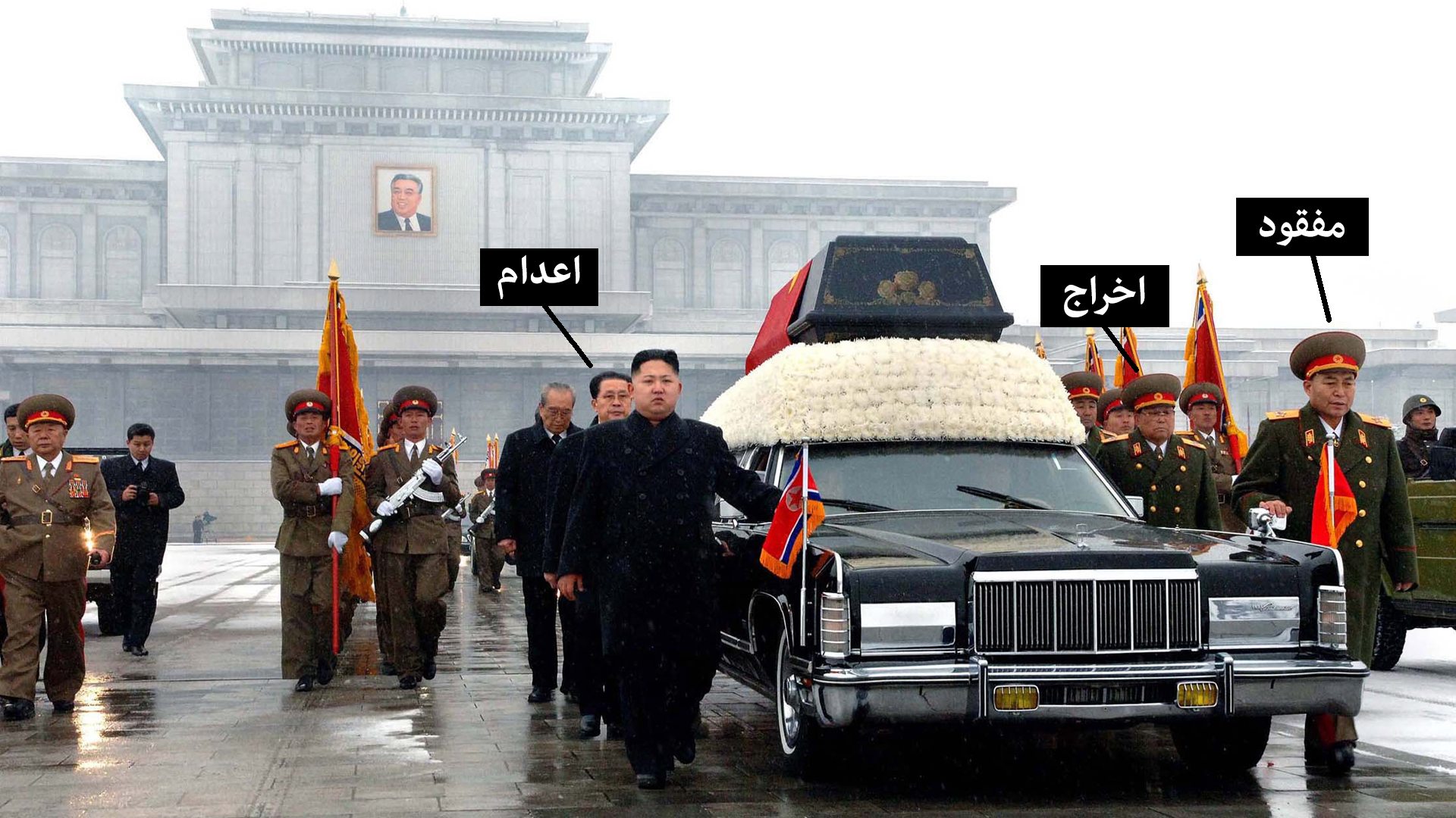 درست پشت سر مرد جوان، دایی او چانگ سونگ-تائک حرکت میکرد که بسیاری او را دومین مرد قدرتمند کره شمالی میدانستند. آن سوی دیگر اتومبیل، ری یونگ-هو، رئیس ستاد کل نیروهای مسلح، و کیم یونگ-چون، وزیر دفاع در کنار اتومبیل راه میرفتند.