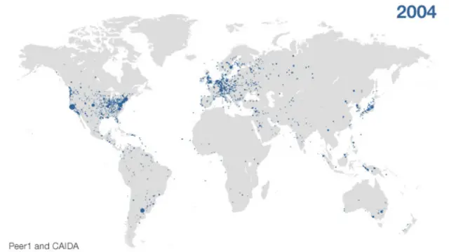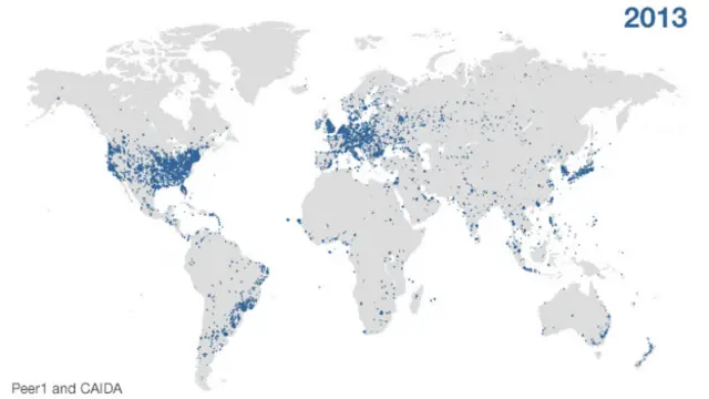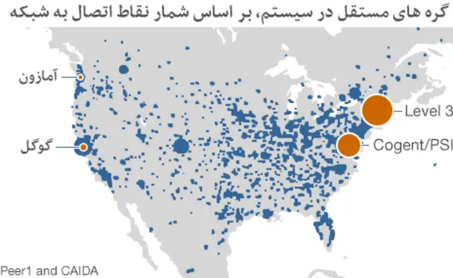 نقشه بالا که با استفاده از اطلاعات <link type="page"><caption> نقشه اینترنت "پیر ۱ هوستینگ"</caption><url href="http://www.peer1.com/blog/peer-1-hosting-launches-map-of-the-internet-app" platform="highweb"/></link> (PEER 1 Hosting) تهیه شده، اتصال شرکت ها و سازمان های اینترنتی را به شبکه نشان می دهد. آنهایی که نقاط اتصالشان به شبکه، بیشترین است، همان شرکت هایی هستند که زیرساخت ها را در اختیار دارند و به مراتب بزرگتر از شرکت هایی مانند گوگل و آمازونند.