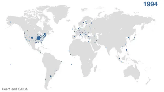 اینترنت شبکه ای در حال گسترش است. این گسترش، نیاز به زیرساخت فیزیکیِ در حال توسعه دارد، از جمله مسیرها، کابل ها، مراکز داده و سایر سخت افزارها. همانطور که نقشه های زیر نشان می دهد، بین سال های ۱۹۹۴ و ۲۰۱۳ حجم این سخت افزارها چندین برابر شده است.