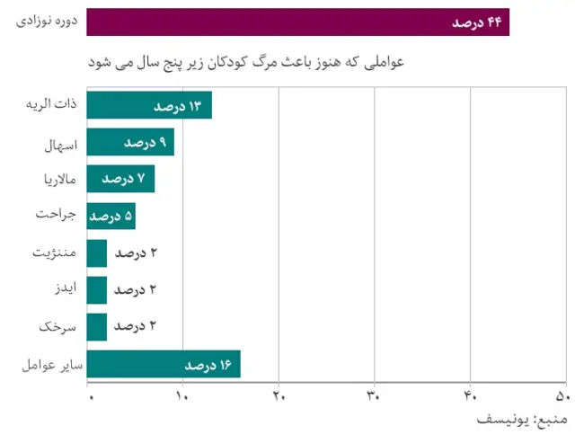 با این حال نزدیک به نیمی از موارد مرگ زیر پنج سال ( ۴۴ درصد) در دوره نوزادی اتفاق میافتد.
