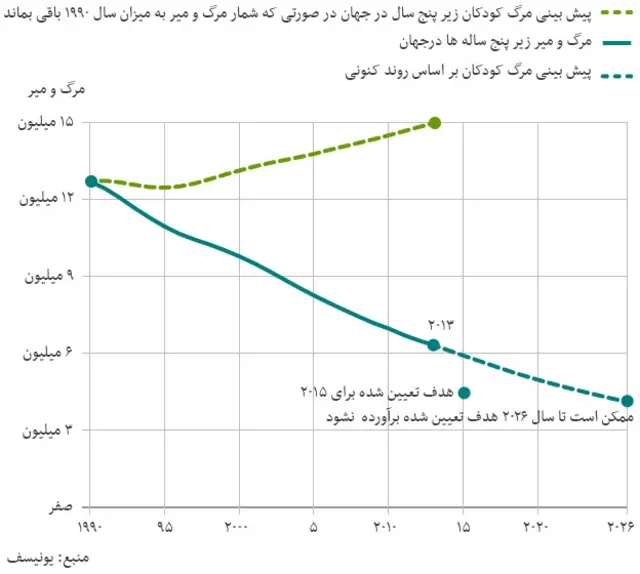 در سال ۱۹۹۰ سالانه ۱۲.۷ میلیون کودک زیر پنج سال در دنیا میمردند اما در سال ۲۰۱۳ این رقم به ۶.۳ میلیون کاهش یافته است.