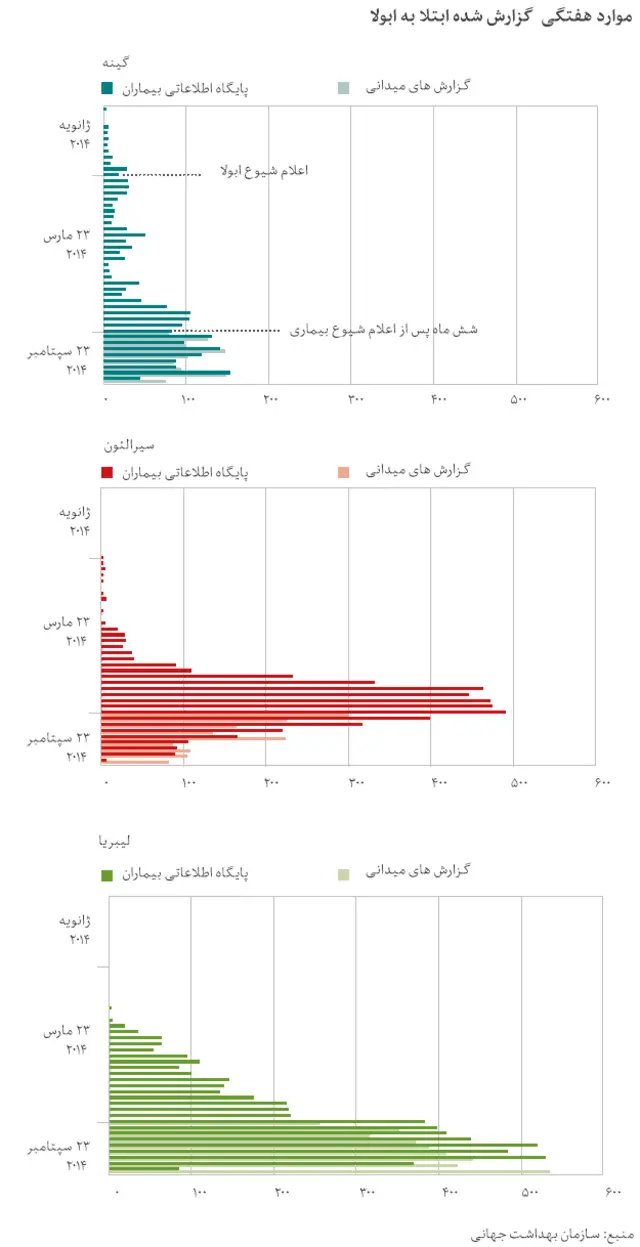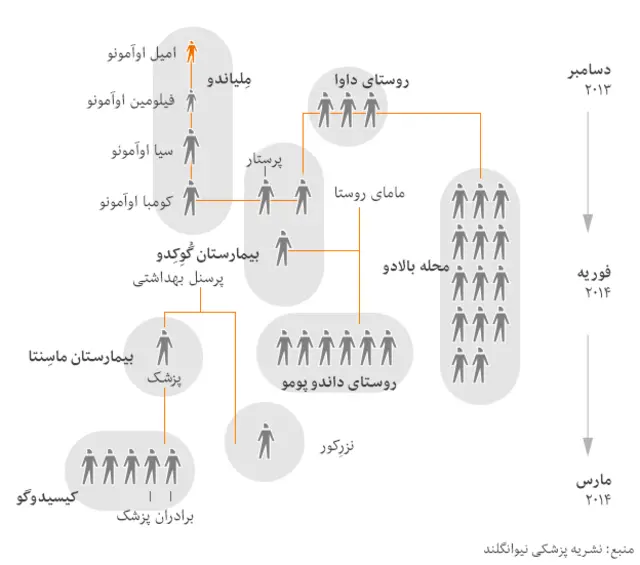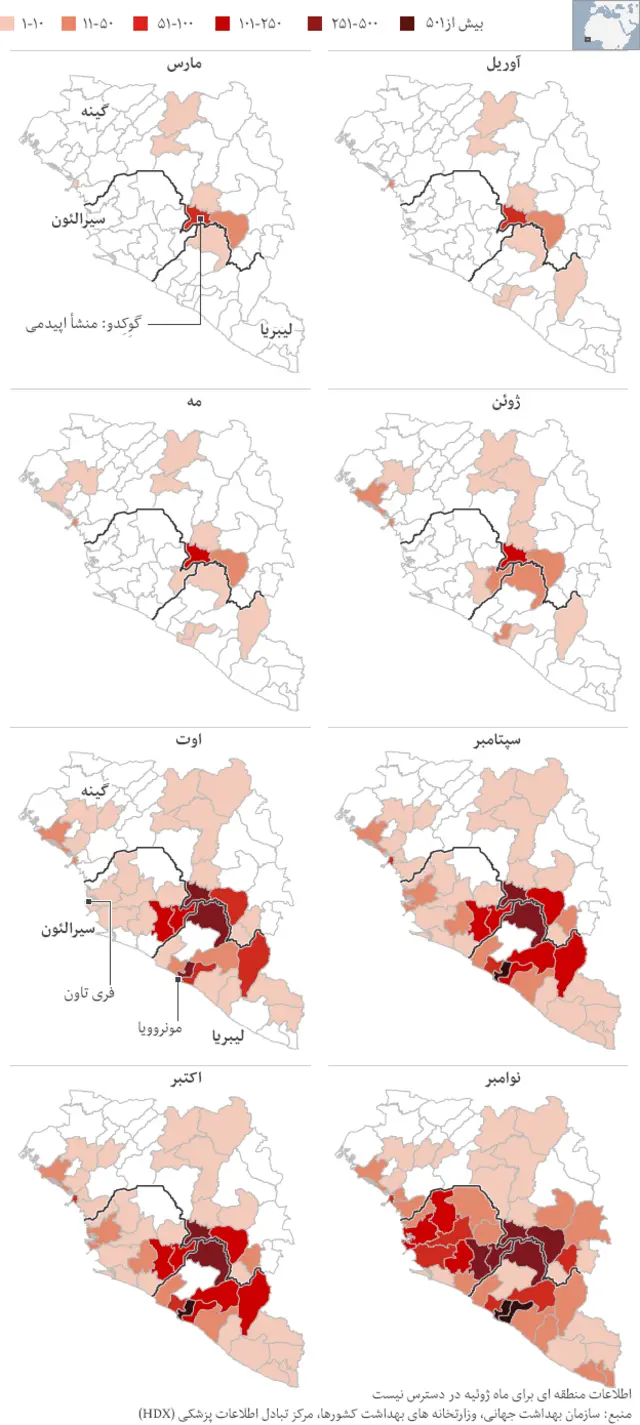 در زیر تصاویری را می بینید که نشان دهنده نحوه آغاز این بیماری از روستایی در گینه، شیوع آن به کشورهای دیگر و آمار بیماران است.