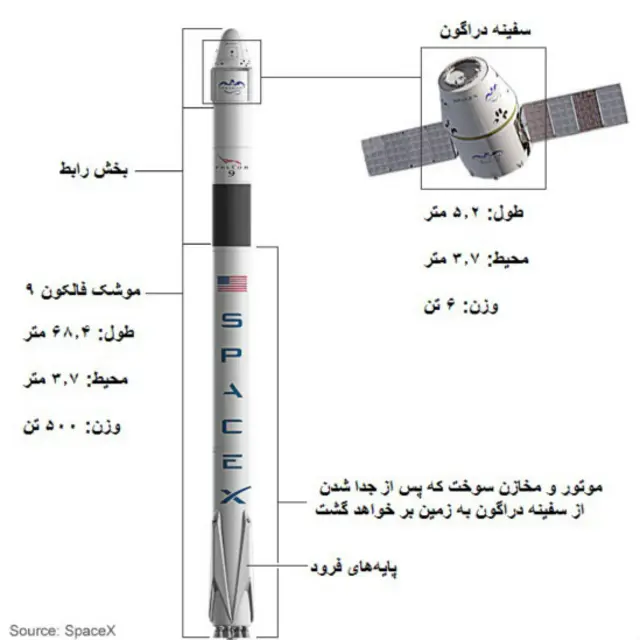 موشک فالکون ۹ و سفینه دراگون، موشک اصلی ارسال محموله به ایستگاه فضایی بینالمللی، از سه قسمت اصلی تشکیل شده است: