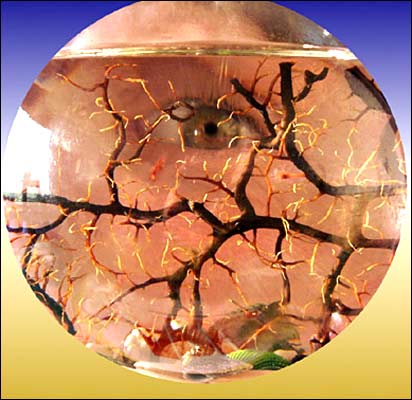 | | چشمی در حال مطالعه يک اکوسيستم خودکفا که در آن هر موجود از موجود ديگر يا فضولات آن تغذيه می کند. تنها چيزی که اين محفظه کروی کاملا بسته به آن نياز دارد خورشيده است تا گياه به توليد اکسيژن بپردازد. اين کره مثل يک زمين کوچک است- عکس از ماکسيميليان اشنايدر |